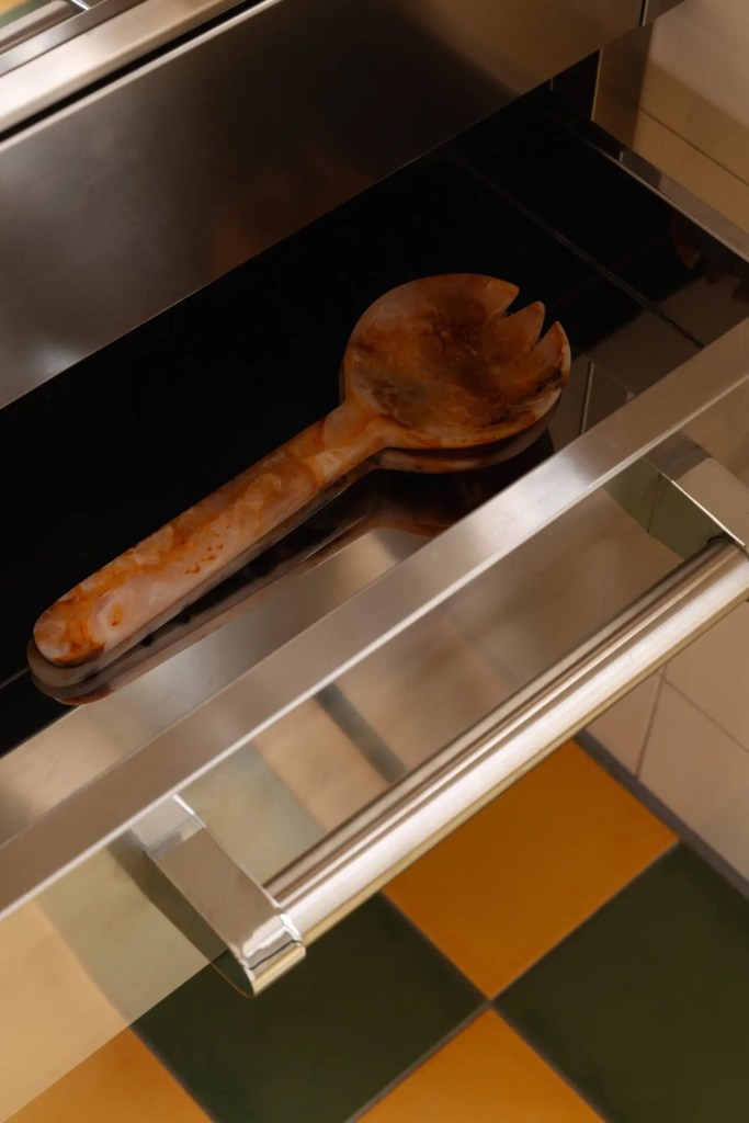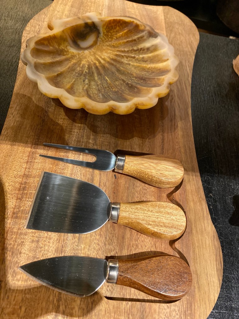 Smörknivar, snäckor och salladsbestick av ett mixat material .