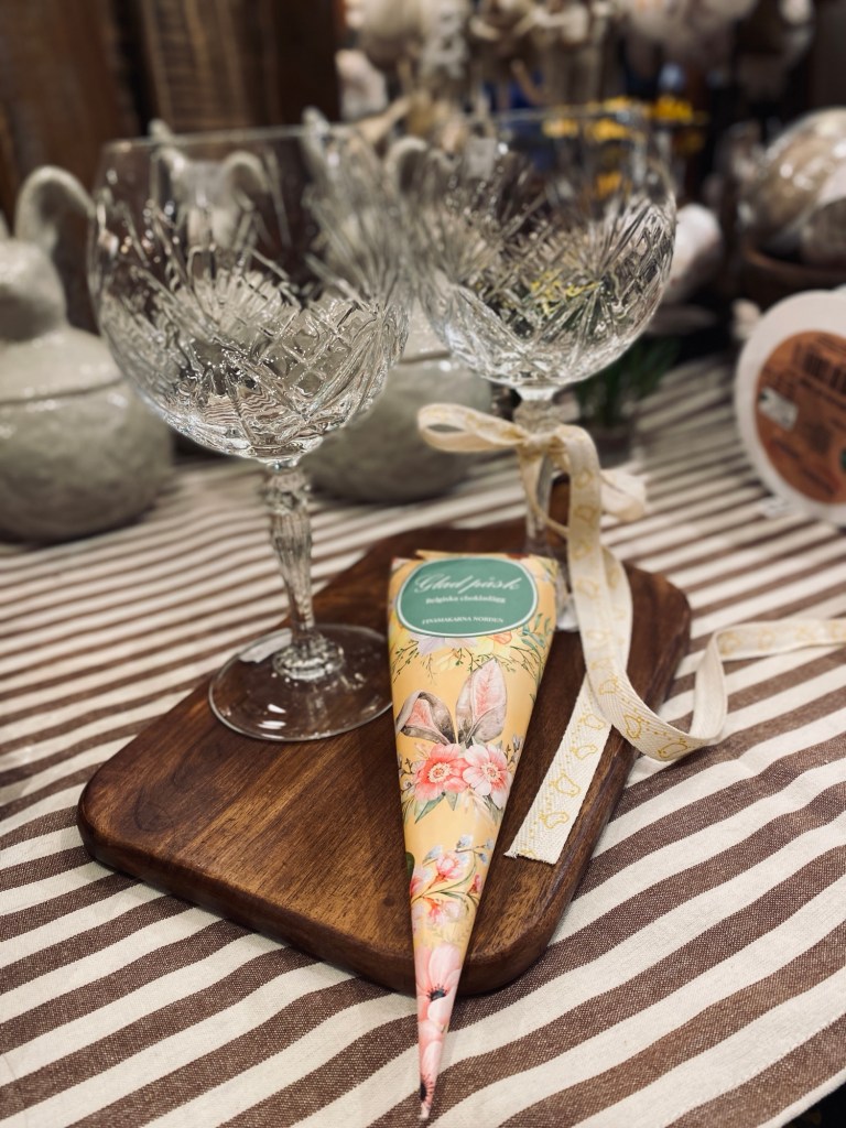 Strutar med chokladpraliner och så himla fint med en rosett på vinglaset. Vi har flera härliga band i butiken.