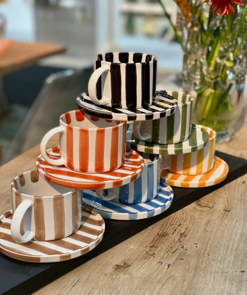och de randiga handmålade kopparna i alla härliga färger.