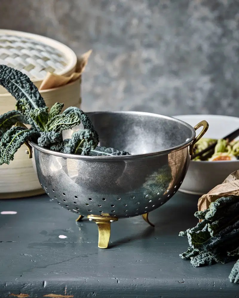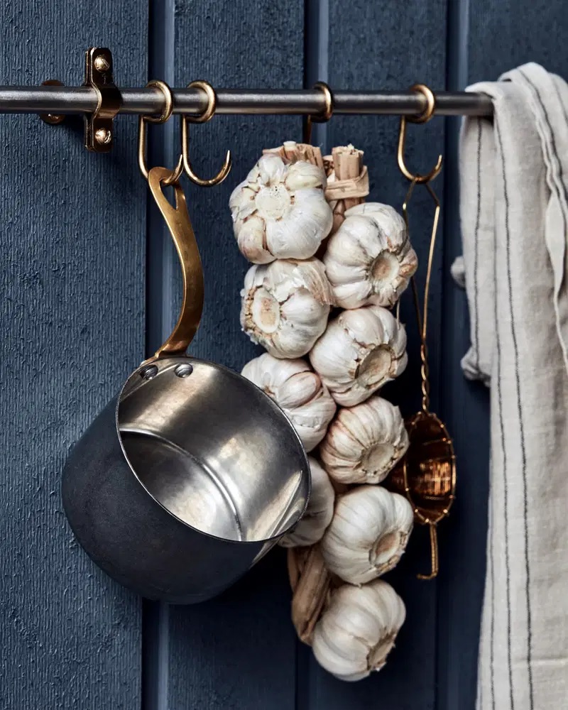 I vårt skafferi har vi satt upp fler kroklister till både kökshanddukar och durkslag av rostfritt och mässing.