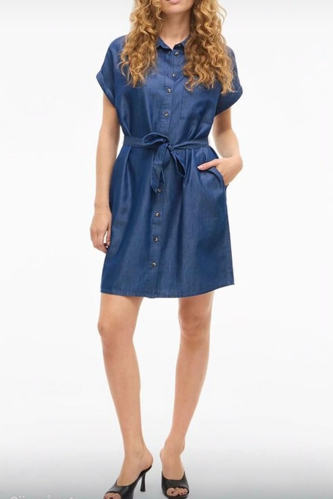 Klänning i mjukaste tyg med en liten ärm och fickor med knappar hela vägen.