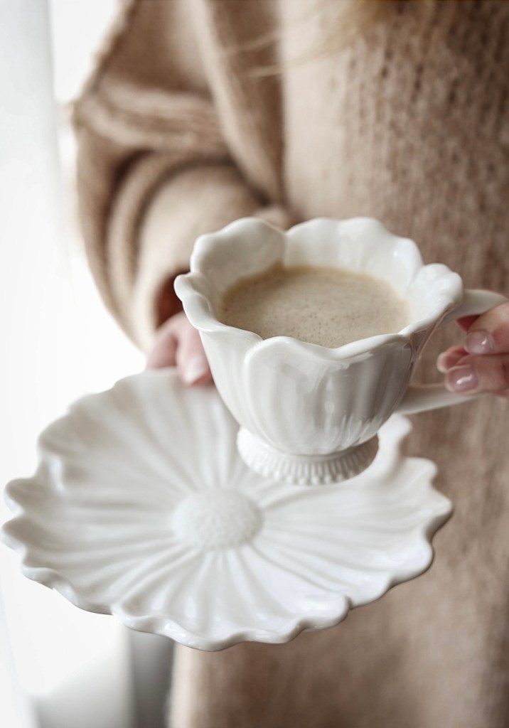 De vita kopparna med formen av blad är så fin. Delarna säljs var för sej och assietten används var för sej eller som fat till koppen.
