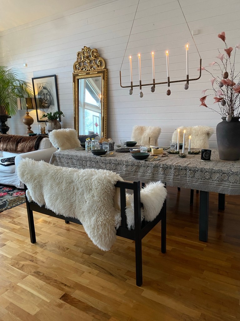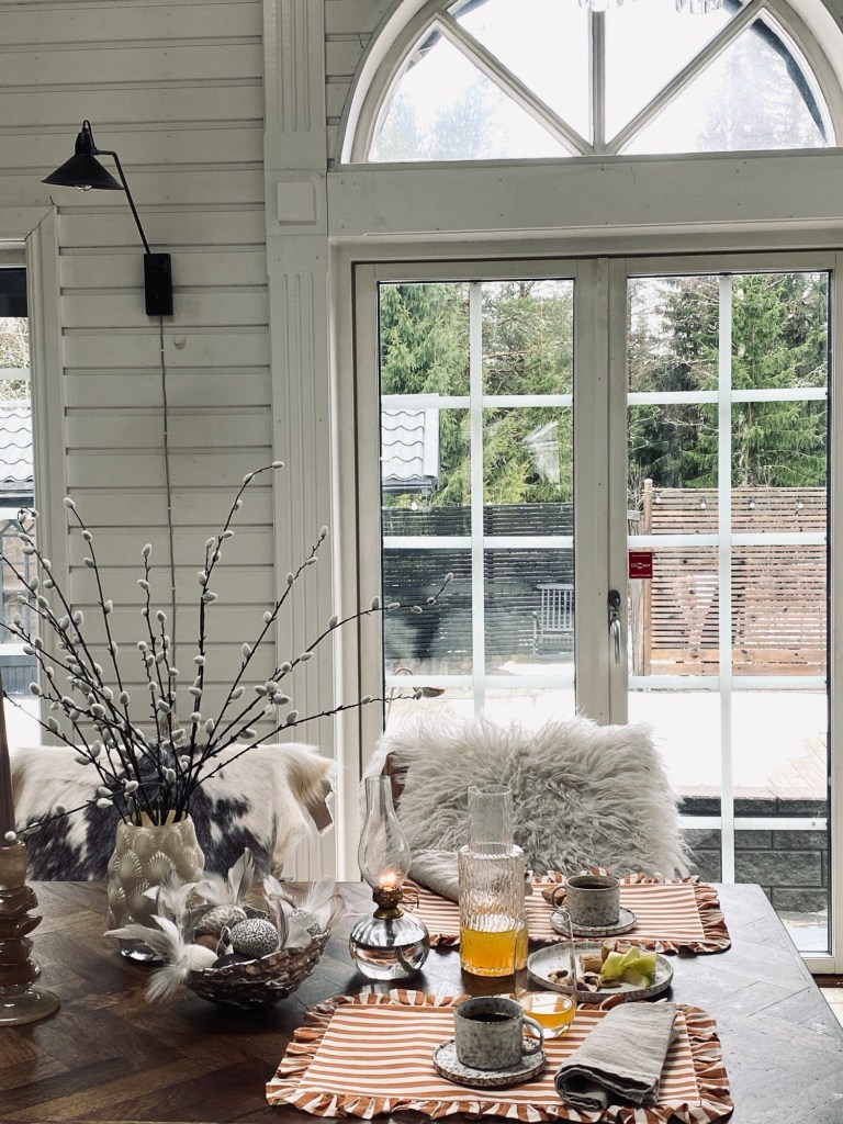 Hej hopp tisdag och hejdå Mars. Hemma i huset har våren flyttat in. Ute i trädgården på baksidan är snön helt borta och i utbyggnaden dukar jag gärna upp med våriga nyanser.
