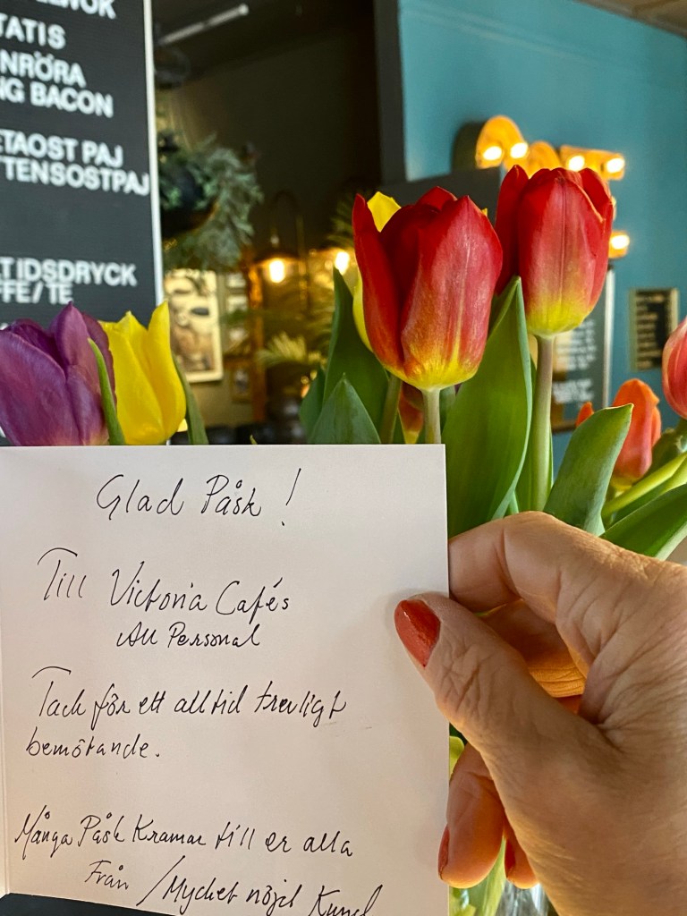 Glad pĂ„skafton vĂ€nner. Blev sĂ„ glad nĂ€r jag kom till butiken och cafĂ©et i gĂ„r. Uppe pĂ„ den lilla kakdisken i hörnet dĂ€r vi har vĂ„ra smĂ„ kakor stod en vas med sprakande tulpaner och ett kort med de mest underbara ord. Ăr sĂ„ stolt över vĂ„r duktiga , duktiga personal. Tusen tack till er alla. Ni Ă€r bĂ€st! Tack du otroligt generösa vĂ€nliga kund. Kortet och blommorna betyder sĂ„ himla mycket.đ€