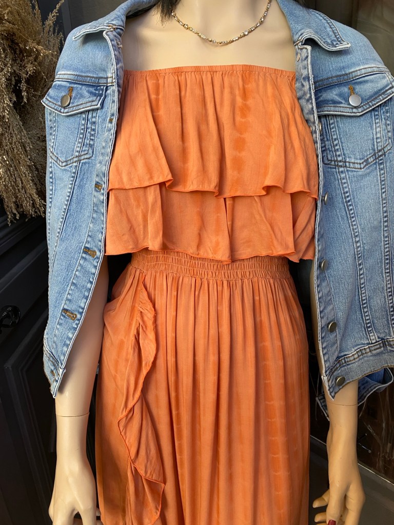 En klänning i bränd ockra blev så fin med jeansjacka till. Den stormönstrade skjortan har en väldigt härlig modell .