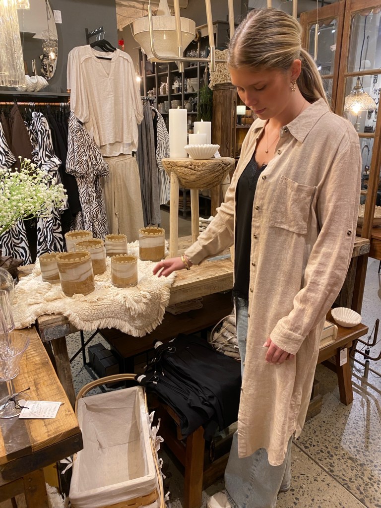 Det är Meya som jobbar idag tillsammans med Vilma. Skjortklänningen av naturmaterialen linne och viskos över ett par jeans och ett linne blev en favorit.