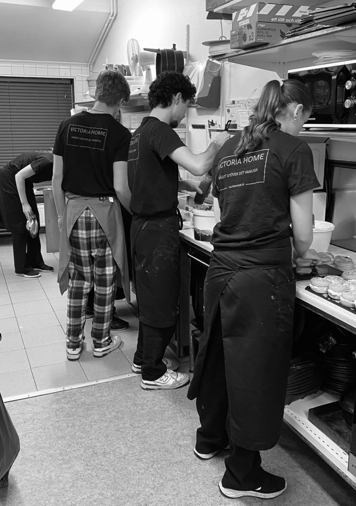 I vårt Cafe Victoria är det full fart och hela morgonen har det bakats bakverk, gjorts rejäla mackor och förberetts för varma goda luncher .