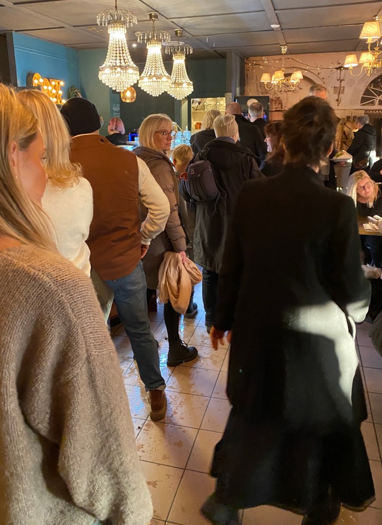 I caféet började kön ringla lång och jag kavlade upp ärmarna och hjälpte till i disken för ett tag. Kunder och gäster får service och jag känner en obeskrivligt varm känsla när det flyter på.