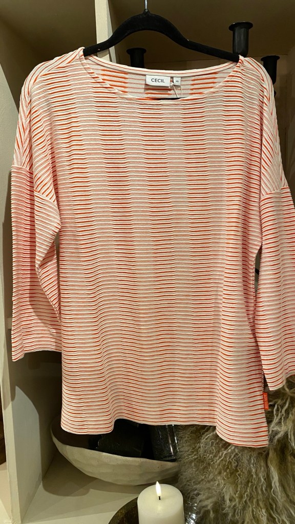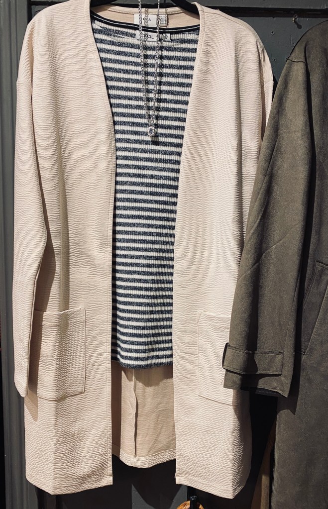 Mysig kofta och en blårandig tröja.