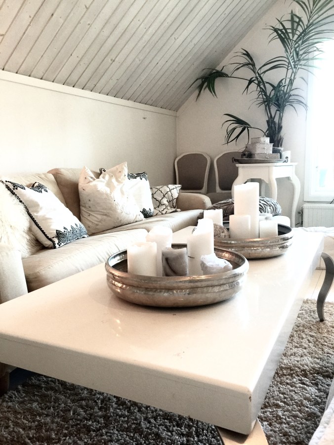 Gav rummet ännu mer vardagsrummskänsla,tycker jag.Vid kassadisken behövdes lite höstmys,mysiga kuddar,rökfärgade ljuslyktor och mässingfärgad bricka gjorde susen,kan tända hur många ljus som helst den här tiden på året,det väger verkligen upp för mörkret.